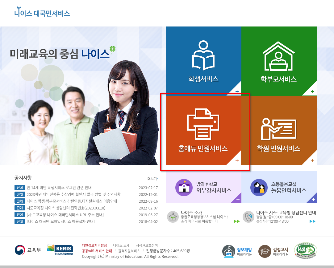나이스 대국민 서비스에 접속한 다음, 홈에듀 민원 서비스를 클릭합니다.