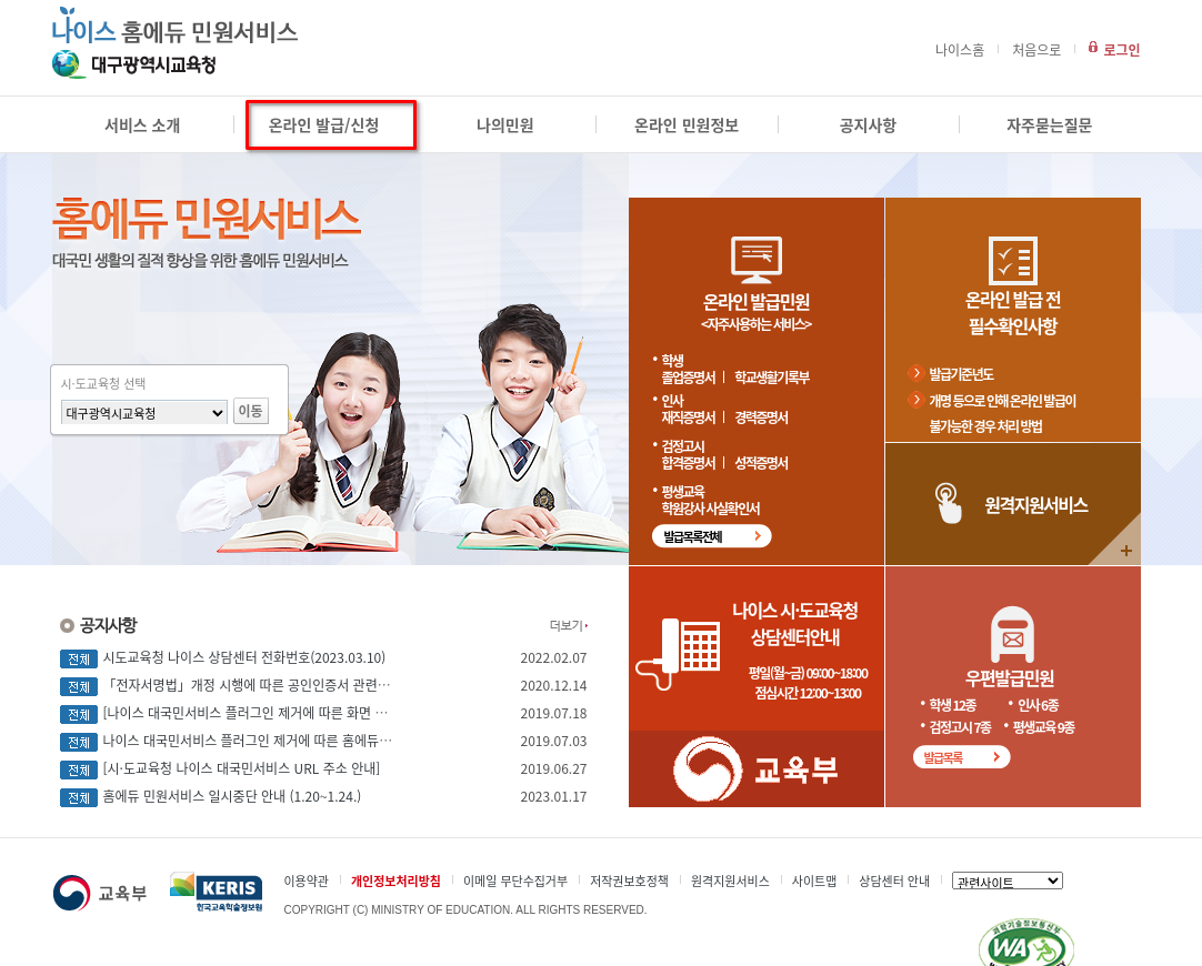 홈에듀 민원서비스로 이동했으면 온라인 발급/신청을 클릭합니다.