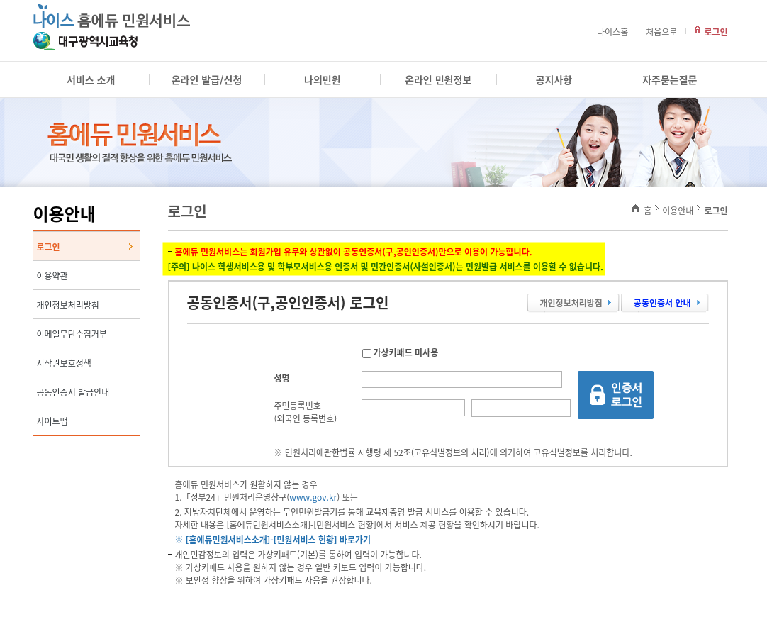 공동인증서로 로그인을 해주셔야 하는데, 나이스용 인증서와 민간 인증서는 사용할 수 없습니다.