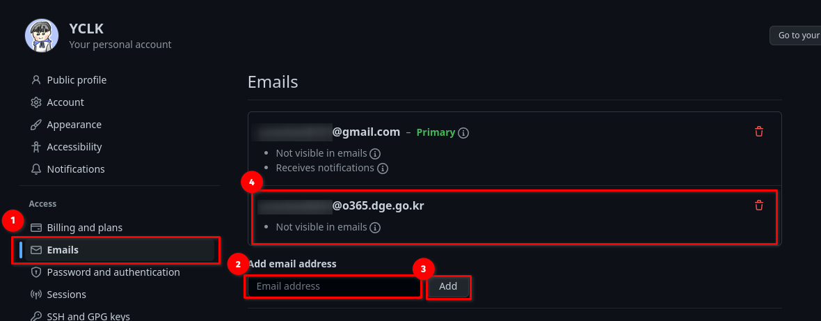 그리고 신청을 하기 전에 해야 할 마지막 설정이 있습니다. 바로 학교 이메일을 깃허브에 등록하는 것인데요, 먼저 깃허브 프로필 세팅으로 접속하도록 하겠습니다.