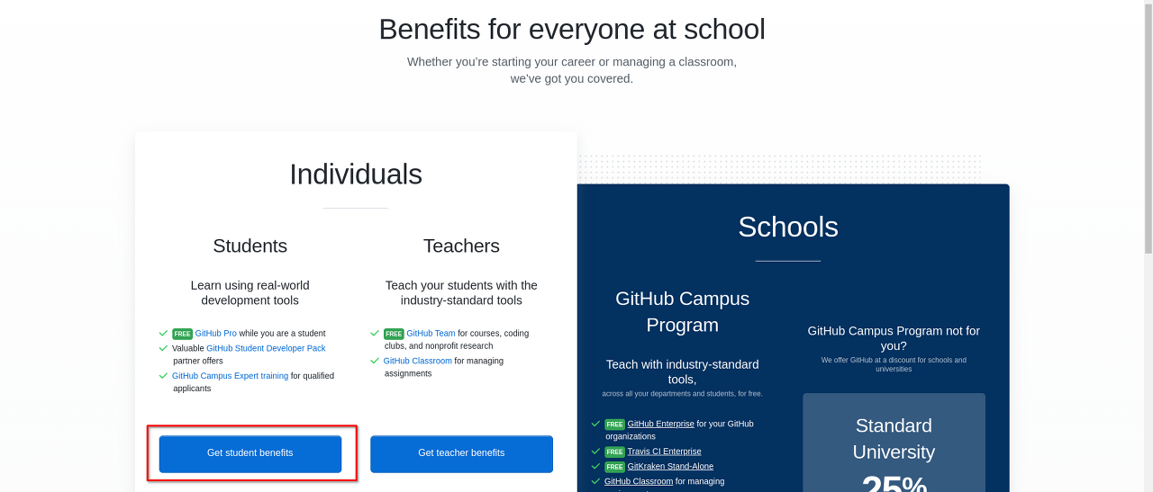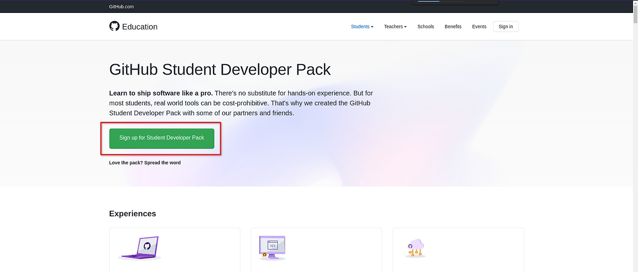 깃허브 에듀케이션 홈페이지로 접속하고 Sign up for Student Developer Pack을 클릭합니다.