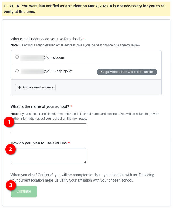 학교 이메일을 선택하고 학교 이름과 적당한 깃허브 사용 목적을 적어줍시다.
